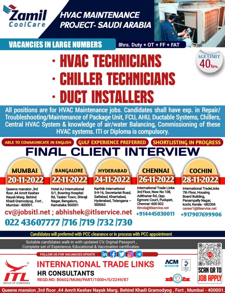 HVAC MAINTENANCEPROJECT- SAUDI ARABIAVACANCIES IN LARGE NUMBERS8hrs. Duty + OT + FF + FATHVAC TECHNICIANSCHILLER TECHNICIANSDUCT INSTALLERSAGE LIMITAll positions are …