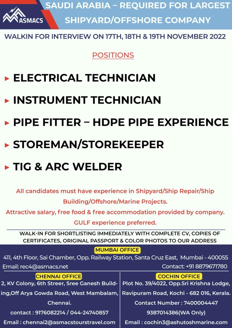 REQUIRED FOR LARGESTSHIPYARD/OFFSHORE COMPANYWALKIN FOR INTERVIEW ON 17TH, 18TH & 19TH NOVEMBER 2022POSITIONSELECTRICAL TECHNICIANINSTRUMENT TECHNICIANPIPE FITTER – HDPE PIPE EXPERIENCESTOREMAN/STOREKEEPERTIG …