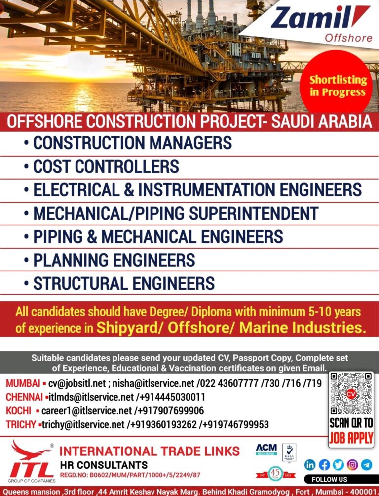 SAUDI ARABIACONSTRUCTION MANAGERSCOST CONTROLLERSELECTRICAL & INSTRUMENTATION ENGINEERSMECHANICAL/PIPING SUPERINTENDENTPIPING & MECHANICAL ENGINEERSPLANNING ENGINEERSSTRUCTURAL ENGINEERSAll candidates should have Degree/ Diploma with minimum …