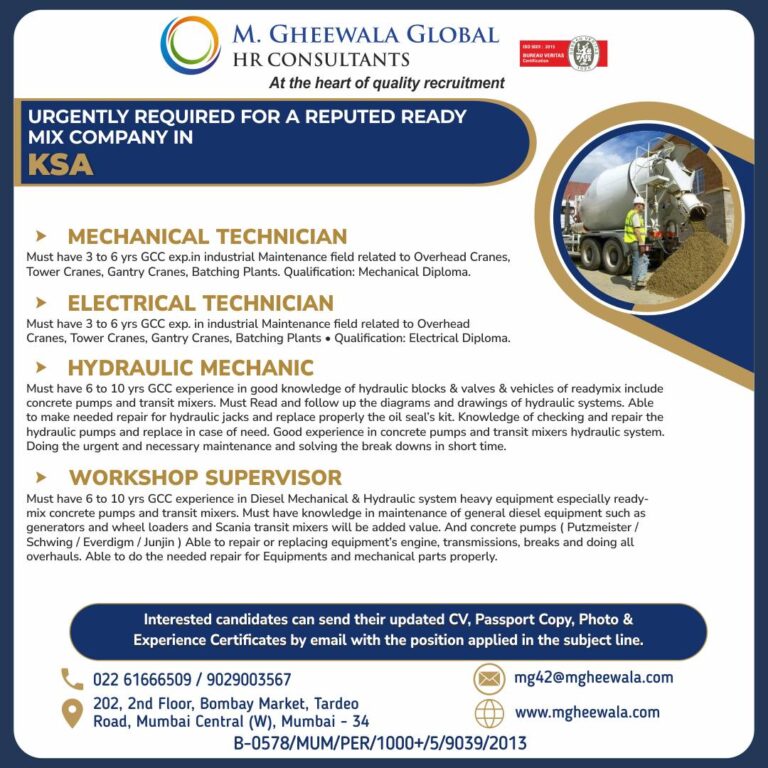 URGENTLY REQUIRED FOR A REPUTED READYMIX COMPANY IN KSAMECHANICAL TECHNICIANMust have 3 to 6 yrs GCC exp.in industrial Maintenance field …