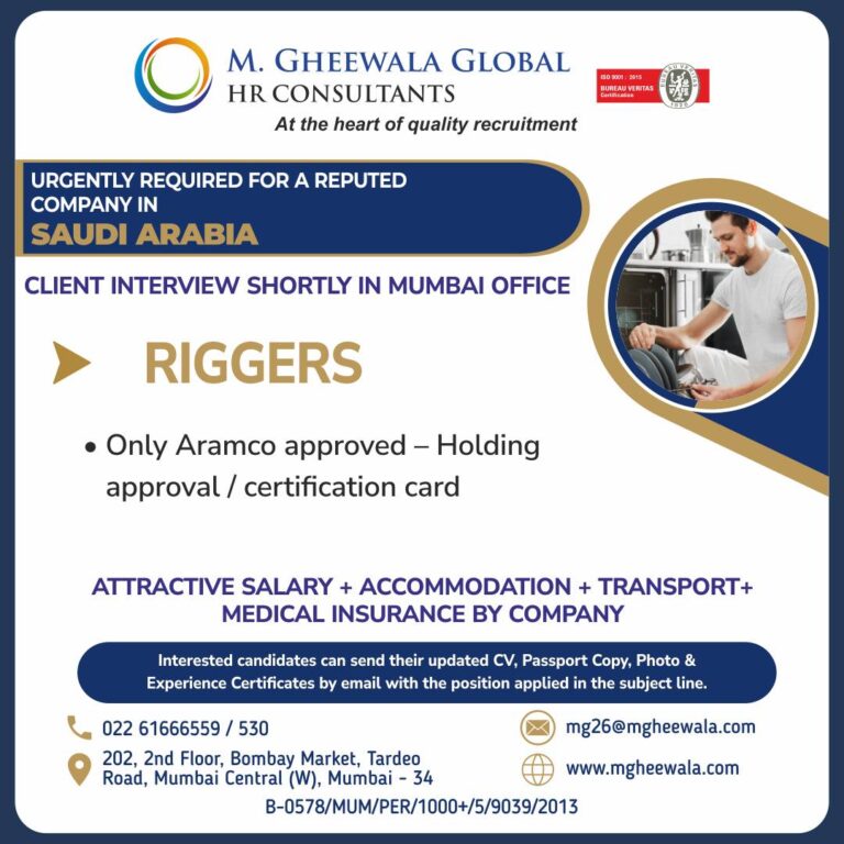 URGENTLY REQUIRED FOR A REPUTEDCOMPANY IN SAUDI ARABIACLIENT INTERVIEW SHORTLY IN MUMBAI OFFICERIGGERS• Only Aramco approved — Holdingapproval / certification …