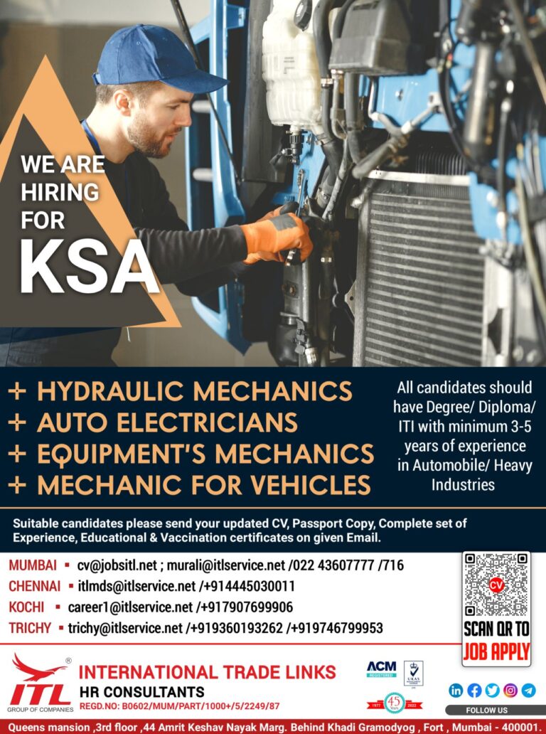 kSA HYDRAULIC MECHANICS AUTO ELECTRICIANSAll candidates shouldhave Degree/ Diploma/ITI with minimum 3-5 EQUIPMENT’S MECHANICS years of experiencein Automobile/ Heavy MECHANIC …