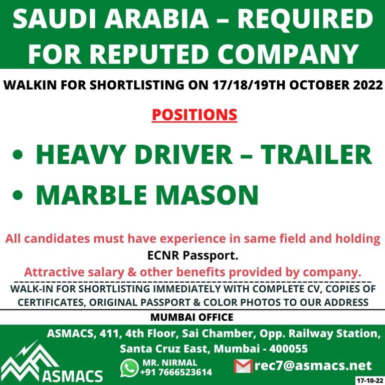 SAUDI ARABIA – REQUIREDFOR REPUTED COMPANYWALKIN FOR SHORTLISTING ON 17118119TH OCTOBER 2022POSITIONSHEAVY DRIVER – TRAILERMARBLE MASONAll candidates must have experience …