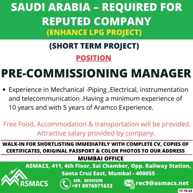 SAUDI ARABIA – REQUIRED FORREPUTED COMPANY(ENHANCE LPG PROJECT)(SHORT TERM PROJECT)POSITIONPRE-COMMISSIONING MANAGER• Experience in Mechanical -Piping ,Electrical, instrumentationand telecommunication .Having a …