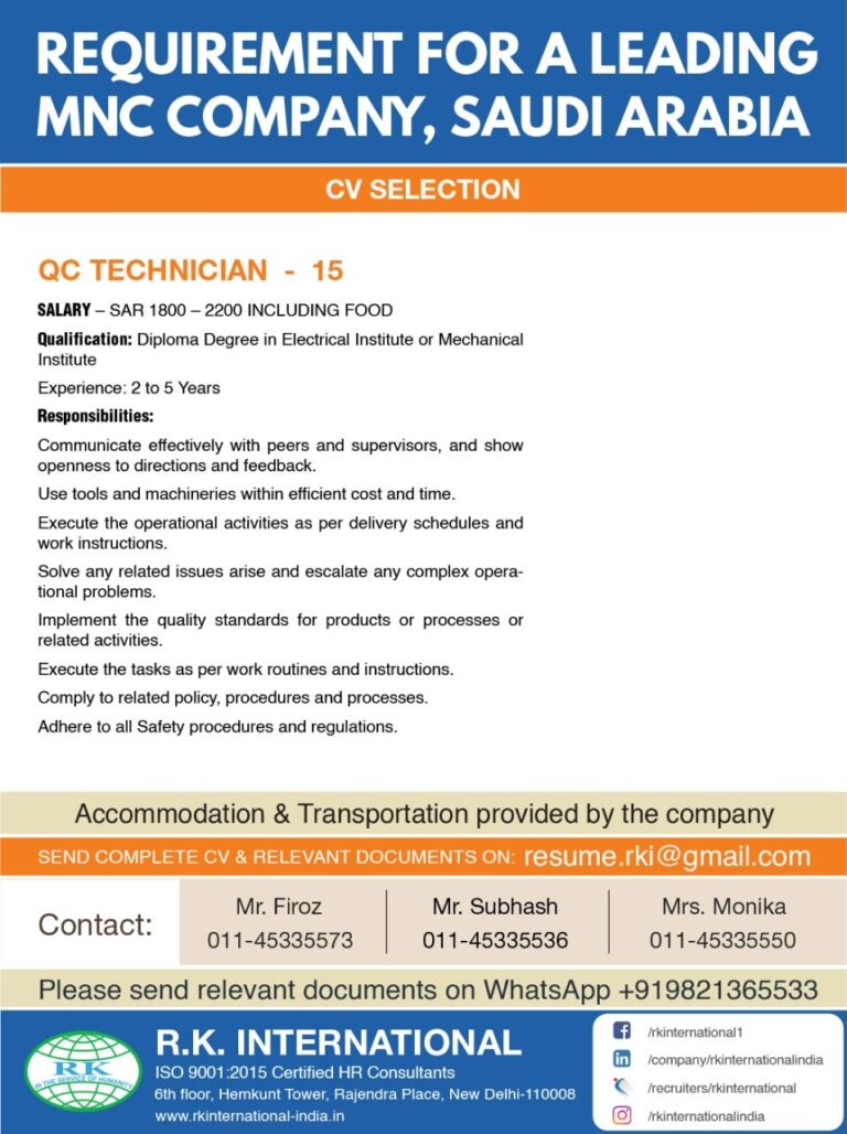 REQUIREMENT FOR A LEADINGMNC COMPANY, SAUDI ARABIACV SELECTIONQC TECHNICIAN – 15SALARY – SAR 1800 – 2200 INCLUDING FOODQualification: Diploma Degree …