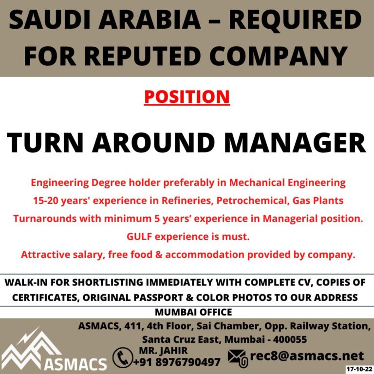 SAUDI ARABIA – REQUIREDFOR REPUTED COMPANYPOSITIONTURN AROUND MANAGEREngineering Degree holder preferably in Mechanical Engineering15-20 years’ experience in Refineries, Petrochemical, Gas …