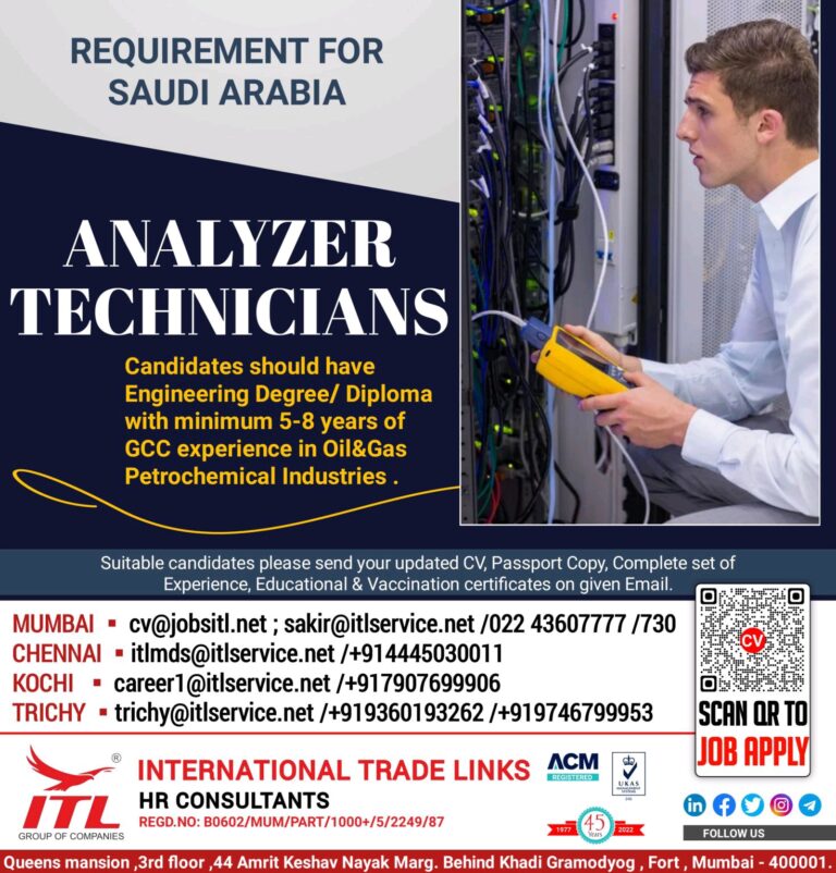 REQUIREMENT FORSAUDI ARABIAANALYZERTECHNICIANSCandidates should haveEngineering Degree/ Diplomawith minimum 5-8 years ofGCC experience in Oil&GasPetrochemical Industries .Suitable candidates please send your …