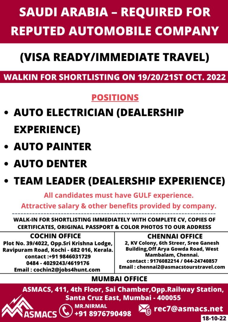 SAUDI ARABIA – REQUIRED FORREPUTED AUTOMOBILE COMPANY(VISA READY/IMMEDIATE TRAVEL)WALKIN FOR SHORTLISTING ON 19120121ST OCT. 2022POSITIONSAUTO ELECTRICIAN (DEALERSHIPEXPERIENCE)AUTO PAINTERAUTO DENTERTEAM LEADER …