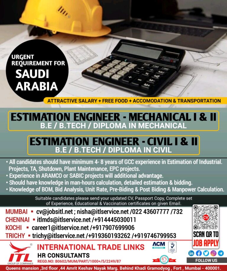 URGENT REQUIREMENT FOR SAUDIARABIAATTRACTIVE SALARY + FREE FOOD + ACCOMODATION & TRANSPORTATIONESTIMATION ENGINEER – MECHANICAL I & IIB.E / B.TECH …