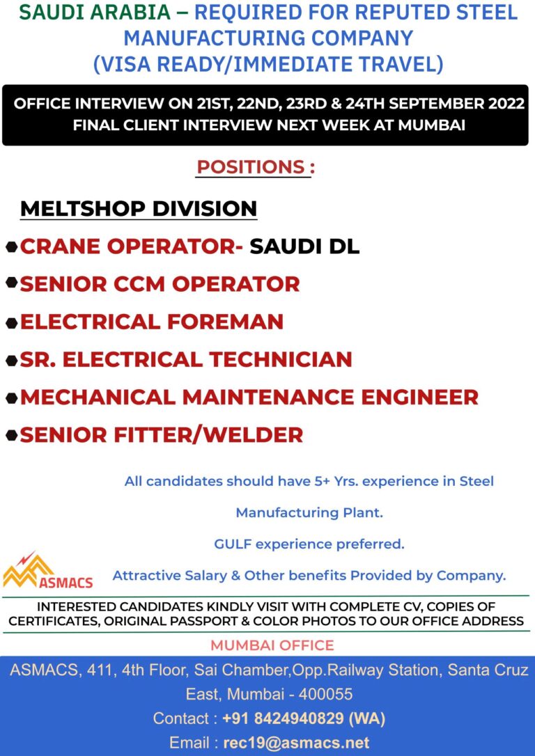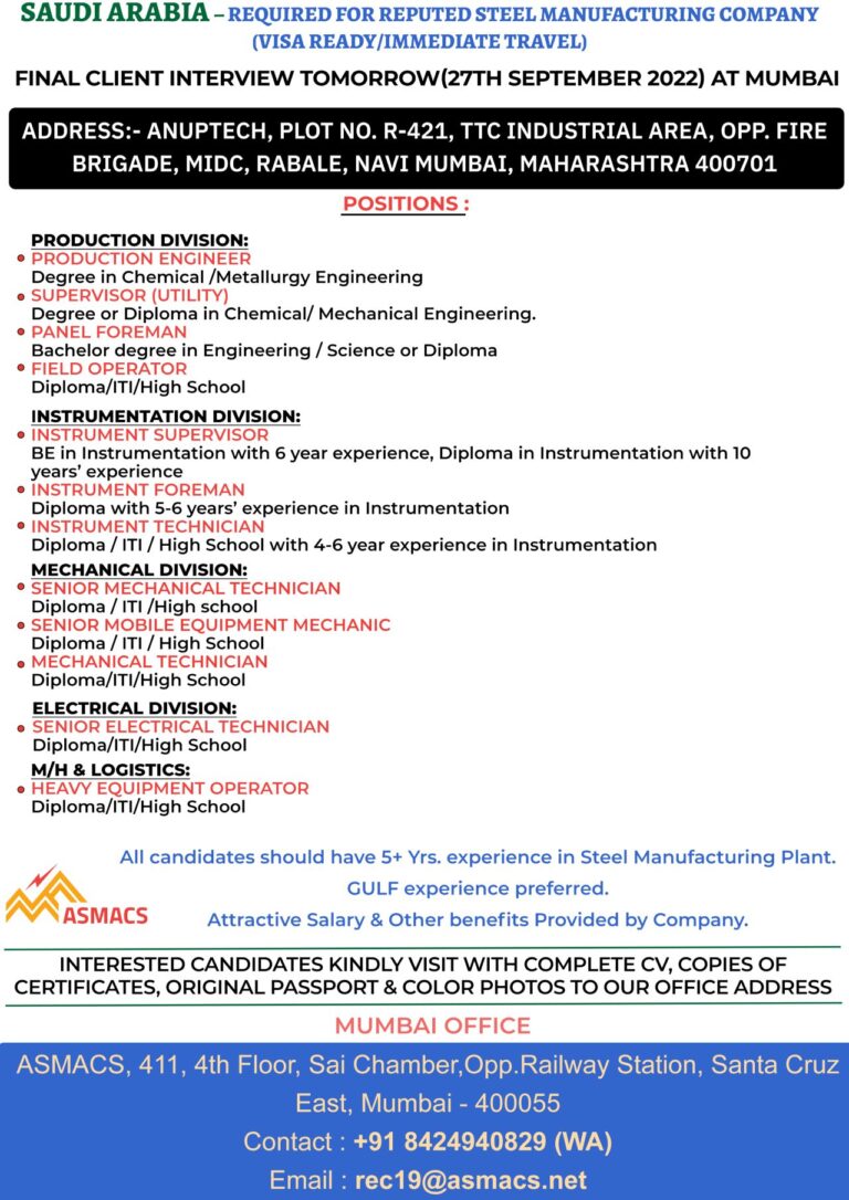 SAUDI ARABIA – REQUIRED FOR REPUTED STEEL MANUFACTURING COMPANY(VISA READY/IMMEDIATE TRAVEL)FINAL CLIENT INTERVIEW TOMORROW(27TH SEPTEMBER 2022) AT MUMBAIADDRESS:- ANUPTECH, PLOT …