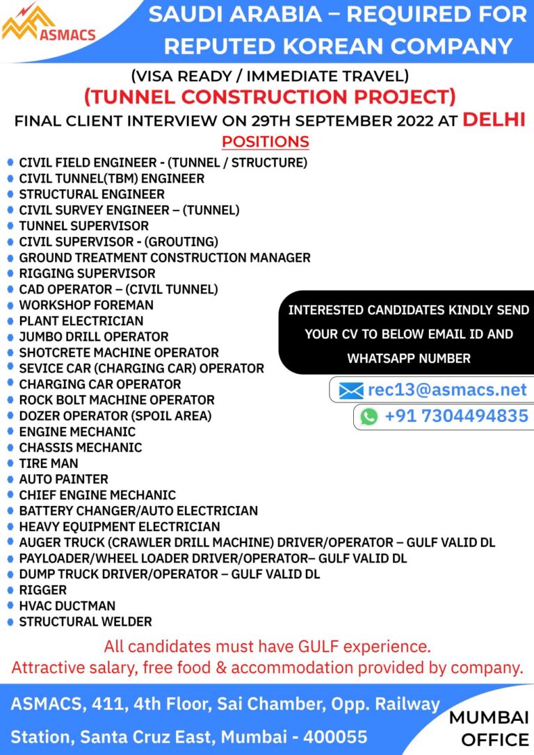 SAUDI ARABIA – REQUIRED FORREPUTED KOREAN COMPANY(VISA READY / IMMEDIATE TRAVEL)(TUNNEL CONSTRUCTION PROJECT)DELHIFINAL CLIENT INTERVIEW ON 29TH SEPTEMBER 2022 ATPOSITIONSCIVIL …