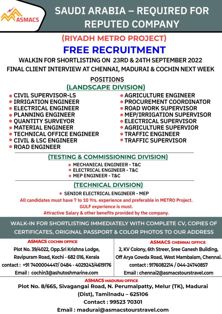 SAUDI ARABIA – REQUIRED FORREPUTED COMPANY(RIYADH METRO PROJECT)FREE RECRUITMENTWALKIN FOR SHORTLISTING ON 23RD & 24TH SEPTEMBER 2022FINAL CLIENT INTERVIEW AT …
