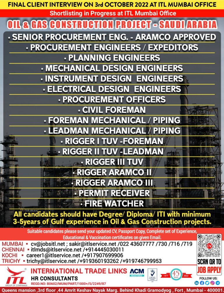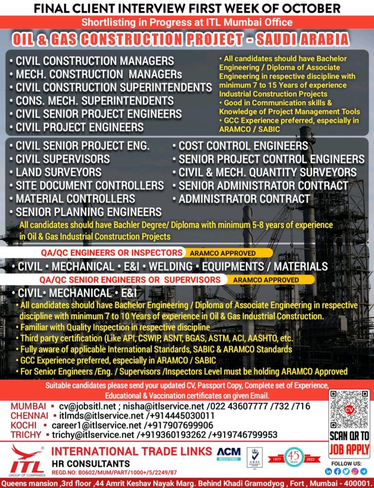 FINAL CLIENT INTERVIEW FIRST WEEK OF OCTOBERShortlisting in Progress at ITL Mumbai OfficeOIL a GAS CONSTRUCTION PROJECT – SAUDI ARABIA• …