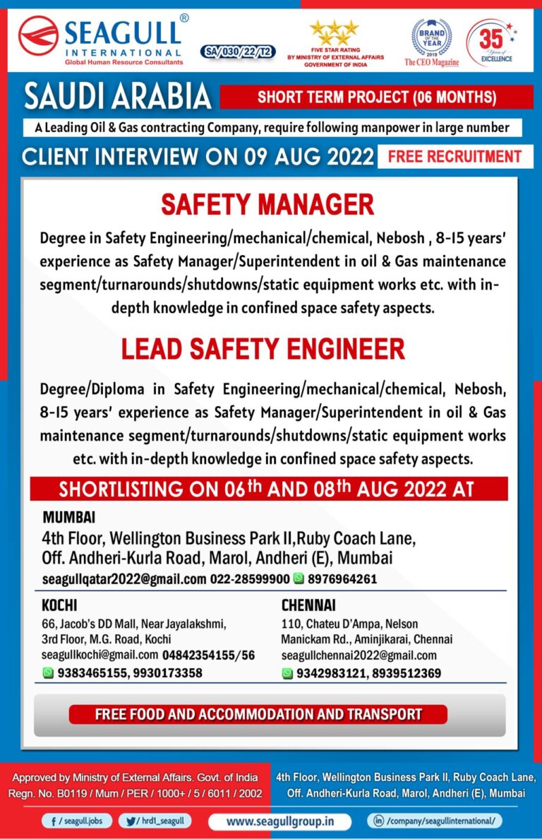 SAUDI ARABIA – REQUIRED FOR REPUTED OIL & GAS COMPANY(SHORT TERM/SHUTDOWN PROJECT)FREE RECRUITMENT WALKIN FOR SHORTLISTING ON 9TH ,10TH & …