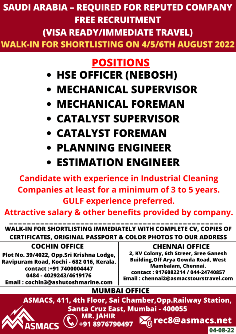 SAUDI ARABIA – REQUIRED FOR REPUTED COMPANYFREE RECRUITMENT(VISA READY/IMMEDIATE TRAVEL)WALK-IN FOR SHORTLISTING ON 41516TH AUGUST 2022POSITIONSI-ISE OFFICER (NEBOSH)MECHANICAL SUPERVISORMECHANICAL FOREMANCATALYST …