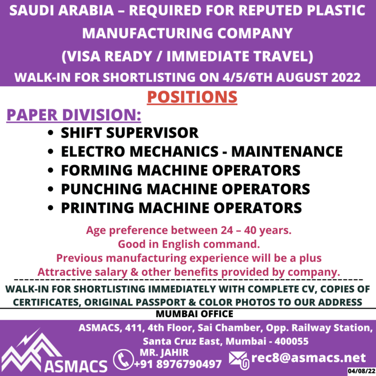 SAUDI ARABIA – REQUIRED FOR REPUTED PLASTICMANUFACTURING COMPANY(VISA READY / IMMEDIATE TRAVEL)WALK-IN FOR SHORTLISTING ON 41516TH AUGUST 2022POSITIONSPAPER DIVISION:• SHIFT …
