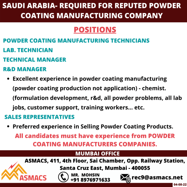 SAUDI ARABIA- REQUIRED FOR REPUTED POWDERCOATING MANUFACTURING COMPANYPOSITIONSPOWDER COATING MANUFACTURING TECHNICIANSLAB. TECHNICIANTECHNICAL MANAGERMANAGER• Excellent experience in powder coating manufacturing(powder coating …