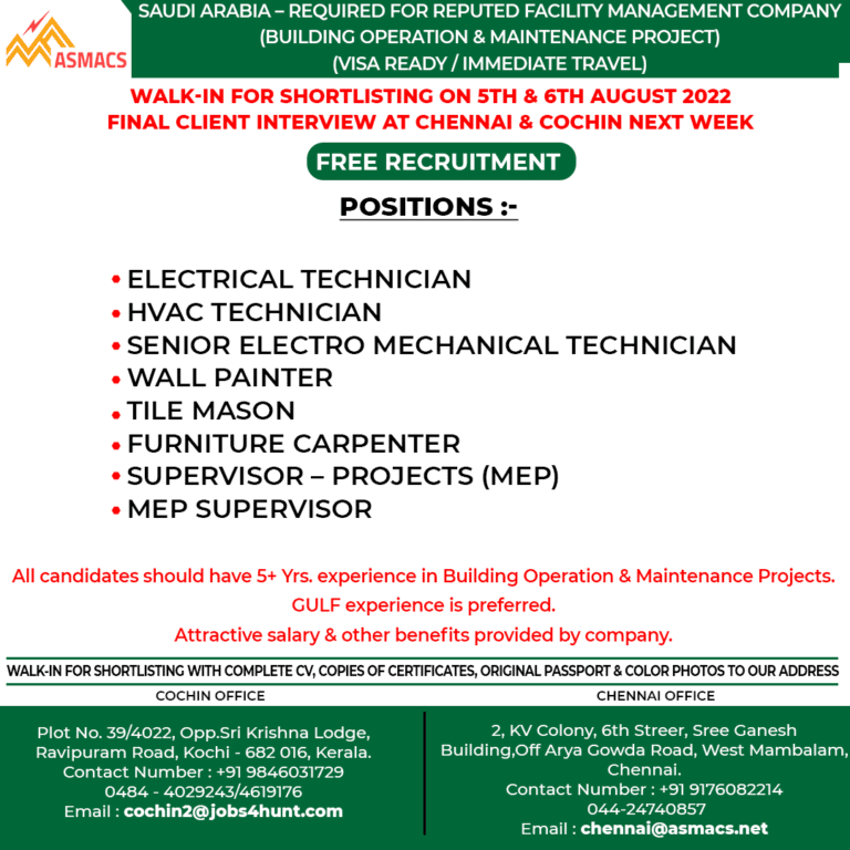 SAUDI ARABIA – REQUIRED FOR REPUTED FACILITY MANAGEMENT COMPANY(BUILDING OPERATION & MAINTENANCE PROJECT)(VISA READY / IMMEDIATE TRAVEL)WALK-IN FOR SHORTLISTING ON …