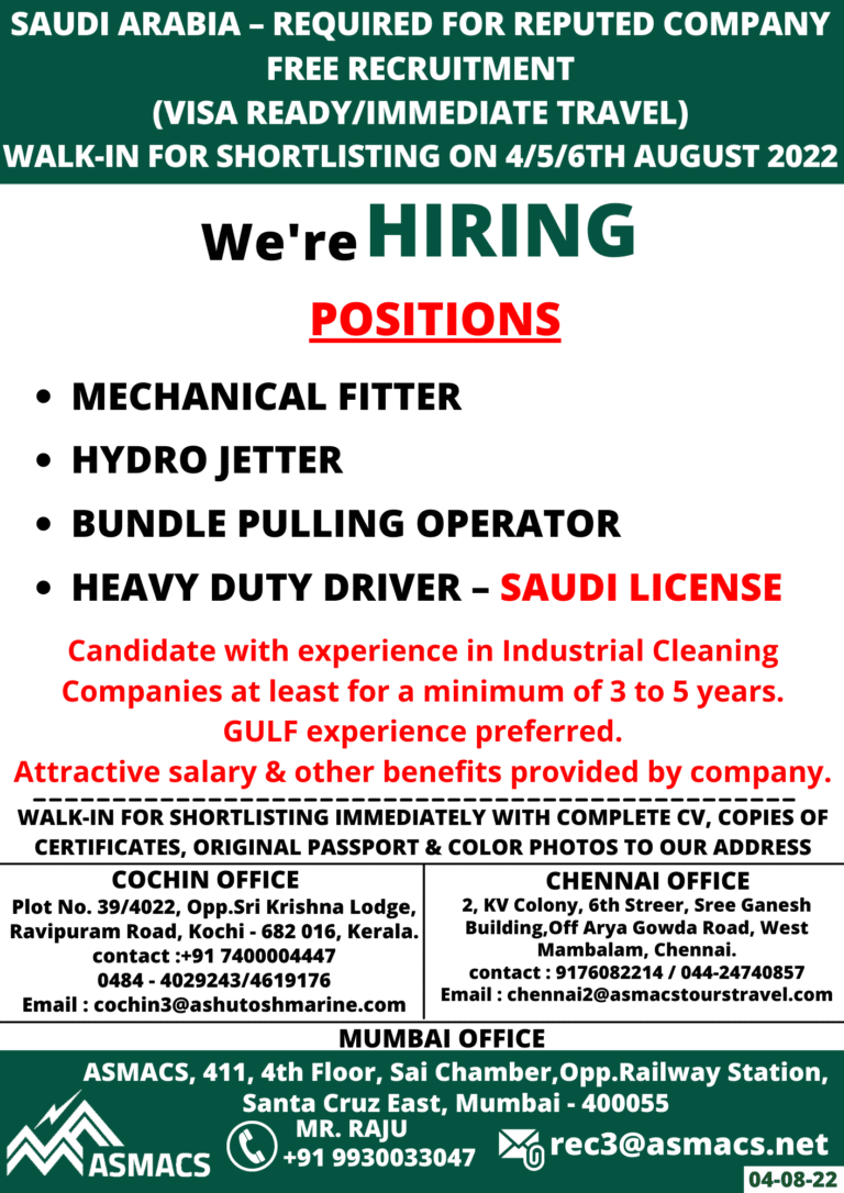 SAUDI ARABIA – REQUIRED FOR REPUTED COMPANYFREE RECRUITMENT(VISA READY/IMMEDIATE TRAVEL)WALK-IN FOR SHORTLISTING ON 41516TH AUGUST 2022HIRINGWe’rePOSITIONS• MECHANICAL FITTERHYDRO JETTERBUNDLE PULLING …