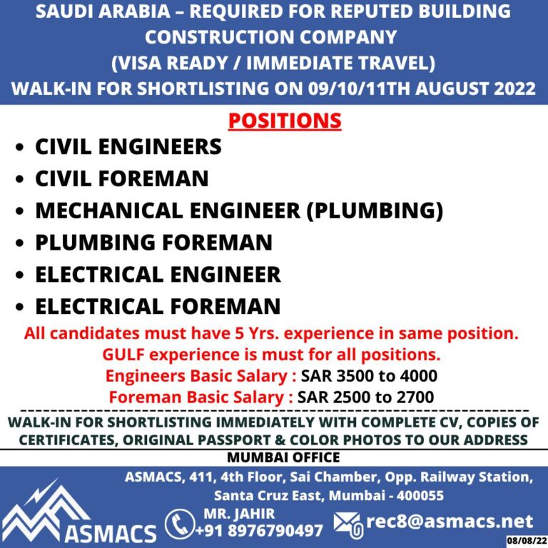 SAUDI ARABIA – REQUIRED FOR REPUTED BUILDINGCONSTRUCTION COMPANY(VISA READY / IMMEDIATE TRAVEL)WALK-IN FOR SHORTLISTING ON 09/10/11TH AUGUST 2022POSITIONSCIVIL ENGINEERSCIVIL FOREMANMECHANICAL …