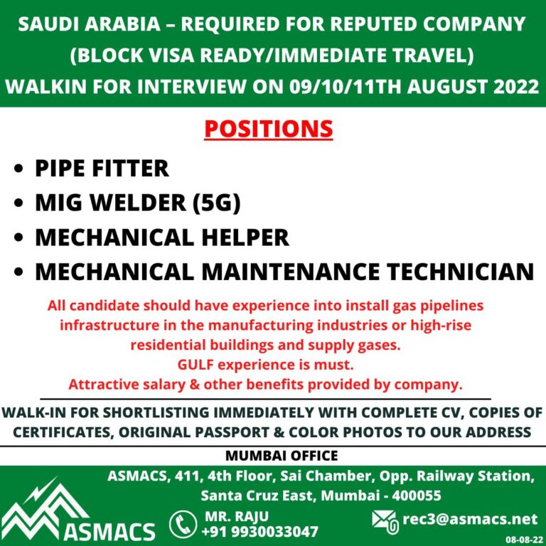 SAUDI ARABIA – REQUIRED FOR REPUTED COMPANY(BLOCK VISA READY/IMMEDIATE TRAVEL)WALKIN FOR INTERVIEW ON 09/10/11TH AUGUST 2022POSITIONS• PIPE FITTER• MIG WELDER …