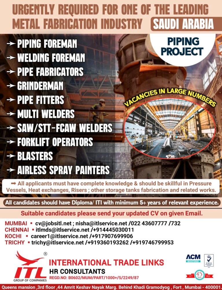 URGENTLY REQUIRED FOR ONE OF THE LEADINGMETAL FABRICATION INDUSTRYSAUDI ARABIAFOREMANFOREMANFABRICATORS PIPE FITTERS MULTI WELDERS SAW/STT-FCAW WELDERS FORKLIFT OPERATORS BLASTERS AIRLESS …