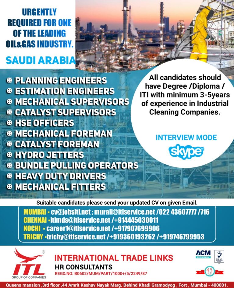 SAUDI ARABIA – REQUIRED FOR REPUTED MARINE COMPANY(OIL &GASONSHORE/OFFSHOREARAMCO PROJECT)WALKIN FOR SHORTLISTING ON 28TH ,29TH, 30TH & 31ST JULY 2022CLIENT …