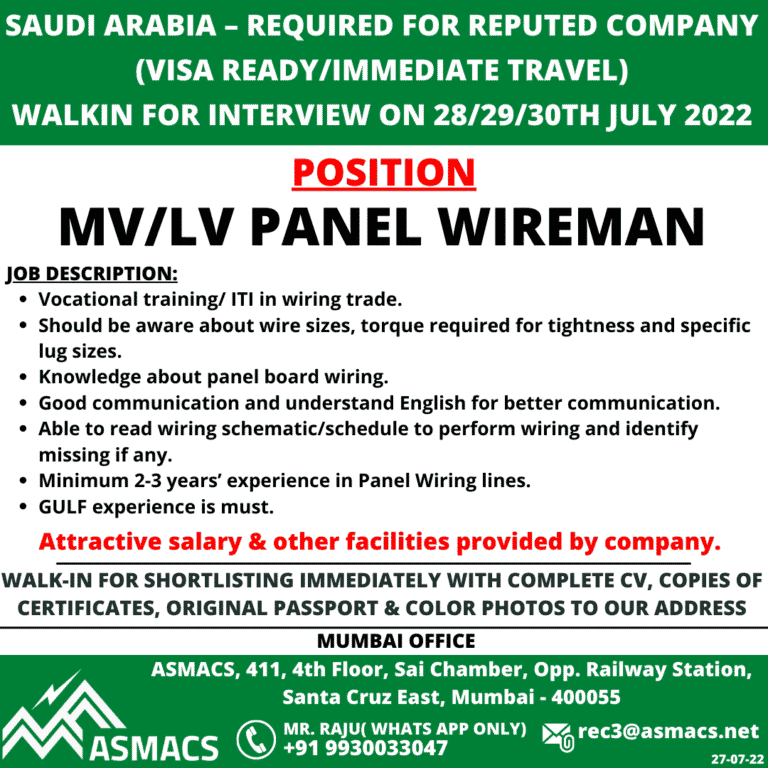 SAUDI ARABIA – REQUIRED FOR REPUTED COMPANY(VISA READY/IMMEDIATE TRAVEL)WALKIN FOR INTERVIEW ON 28129130TH JULY 2022POSITIONMV/LV PANEL WIREMANJOB DESCRIPTION:Vocational training/ ITI …