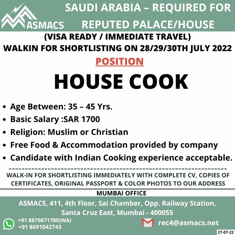 SAUDI ARABIA – REQUIRED FORAAASMACS REPUTED PALACE/HOUSE(VISA READY / IMMEDIATE TRAVEL)WALKIN FOR SHORTLISTING ON 28129130TH JULY 2022POSITIONHOUSE COOKAge Between: 35 …