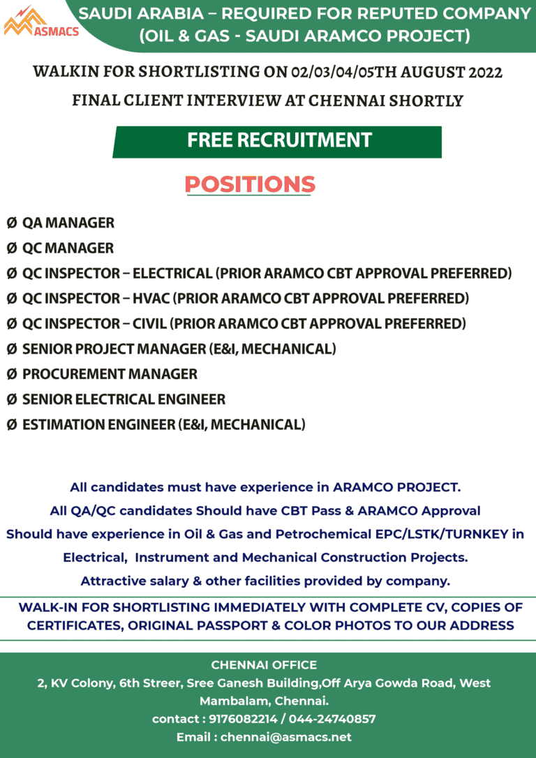 ASMACSSAUDI ARABIA – REQUIRED FOR REPUTED COMPANY(OIL & GAS – SAUDI ARAMCO PROJECT)WALKIN FOR SHORTLISTING ON 02/03/04/05TH AUGUST 2022FINAL CLIENT …