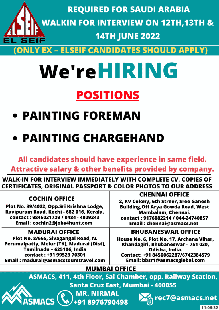 REQUIRED FOR SAUDI ARABIAWALKIN FOR INTERVIEW ON 12TH,13TH &EL SEiF14TH JUNE 2022(ONLY EX – ELSEIF CANDIDATES SHOULD APPLY)we’reHlRlNGPOSITIONSPAINTING FOREMANPAINTING CHARGEHANDAll …
