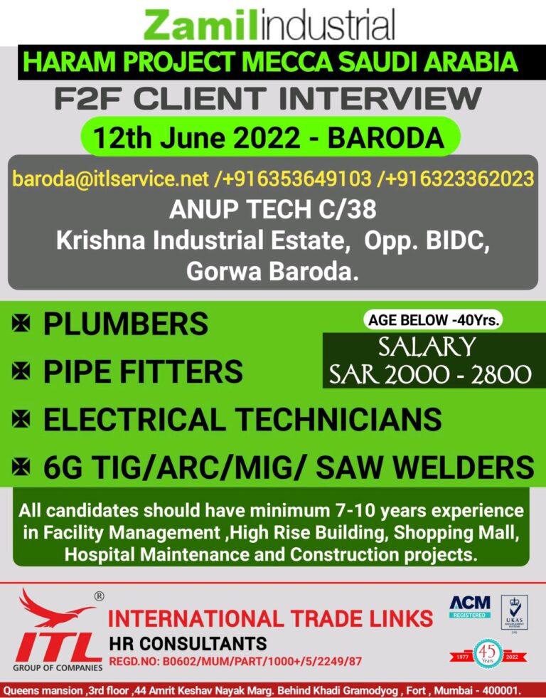 HARAM PROJECT MECCA SAUDI ARABIAF2F CLIENT INTERVIEW12th June 2022 – BARODAbaroda@itlservice.net/+916353649103 /+916323362023ANUP TECH C/38Krishna Industrial Estate, Opp. BIDC,Gorwa Baroda.PLUMBERSPIPE FITTERSAGE …