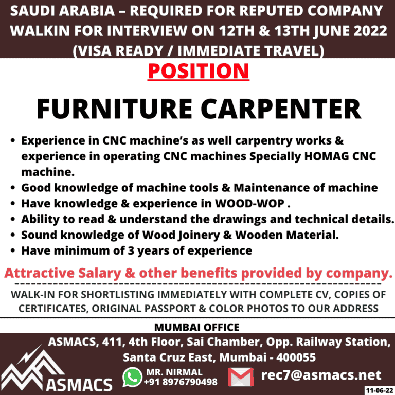 SAUDI ARABIA – REQUIRED FOR REPUTED COMPANYWALKIN FOR INTERVIEW ON 12TH & 13TH JUNE 2022VISA READY / IMMEDIATE TRAVELPOSITIONFURNITURE CARPENTERExperience …