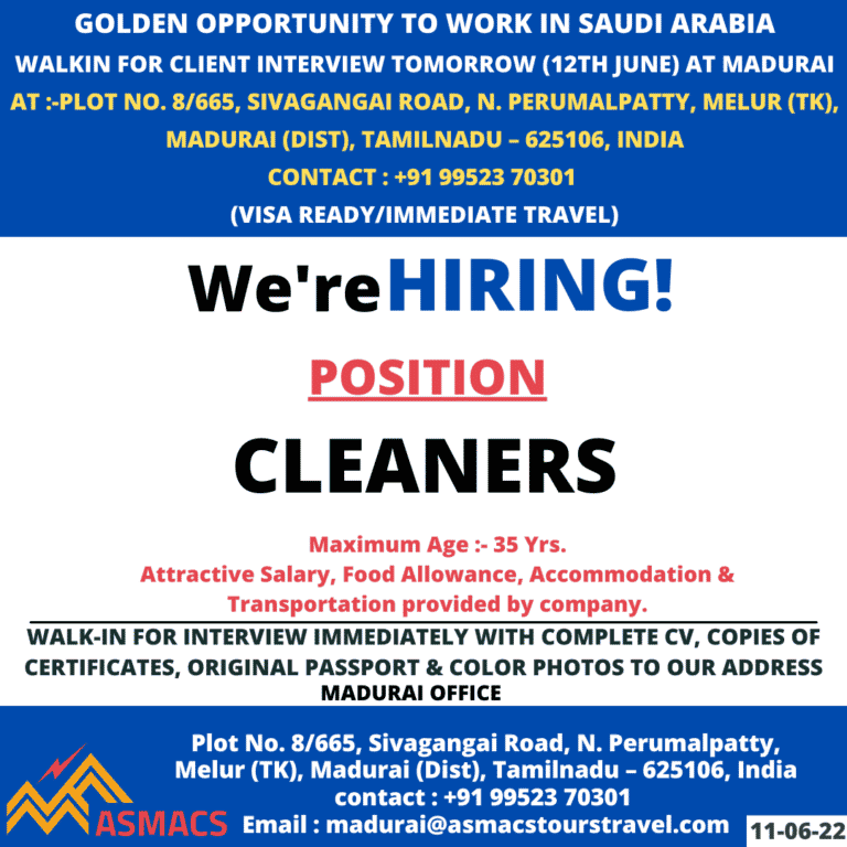 GOLDEN OPPORTUNITY TO WORK IN SAUDI ARABIAWALKIN FOR CLIENT INTERVIEW TOMORROW (12TH JUNE) AT MADURAIAT :-PLOT NO. 8/665, SIVAGANGAI ROAD, …