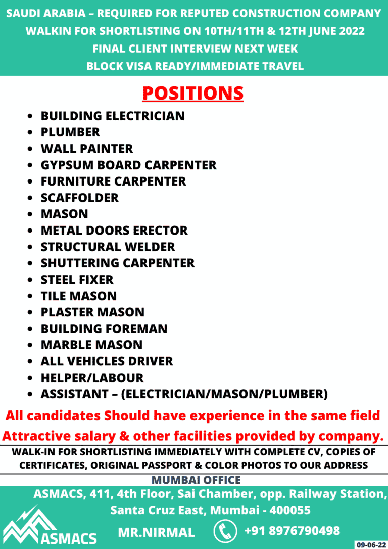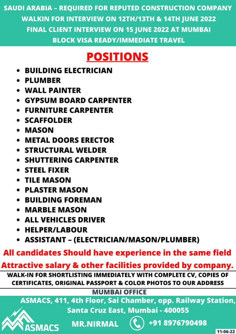 SAUDI ARABIA – REQUIRED FOR REPUTED CONSTRUCTION COMPANYWALKIN FOR INTERVIEW ON 12TH/13TH & 14TH JUNE 2022FINAL CLIENT INTERVIEW ON 15 …