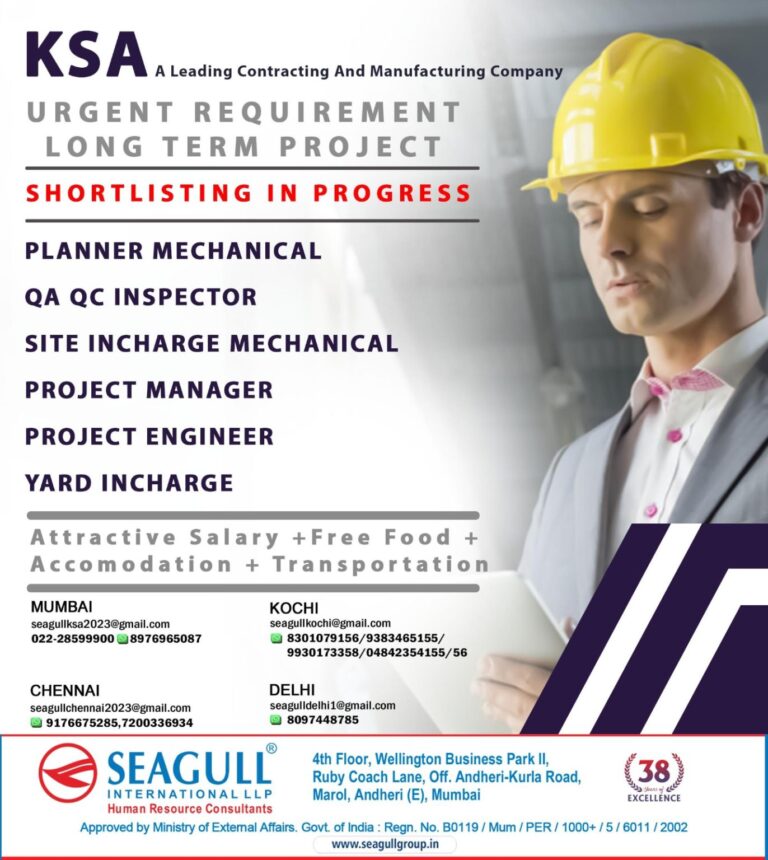 KSAURGENT REQUIREMENTLONG TERM PROJECTSHORTLISTING IN PROGRESSA Leading Contracting And Manufacturing CompanyPLANNER MECHANICALQA QC INSPECTORSITE INCHARGE MECHANICALPROJECT MANAGERPROJECT ENGINEERYARD INCHARGEAttractive Salary …