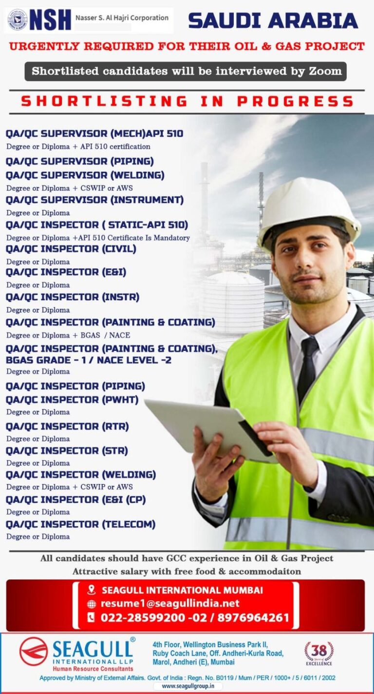 NSHNasser S. Al Hajri CorporationSAUDI ARABIAURGENTLY REQUIRED FOR THEIR OIL & GAS PROJECTShortlisted candidates will be interviewed by ZoomSHORTLISTING IN …
