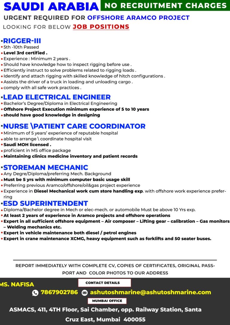 SAUDI ARABIA NO RECRUITMENT CHARGESURGENT REQUIRED FOR OFFSHORE ARAMCO PROJECTLOOKING FOR BELOW JOB POSITIONS-RIGGER-III5th -10th Passed Telegram Group Join Now