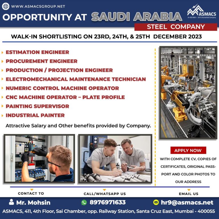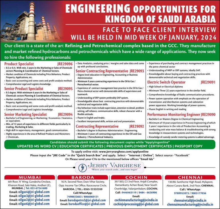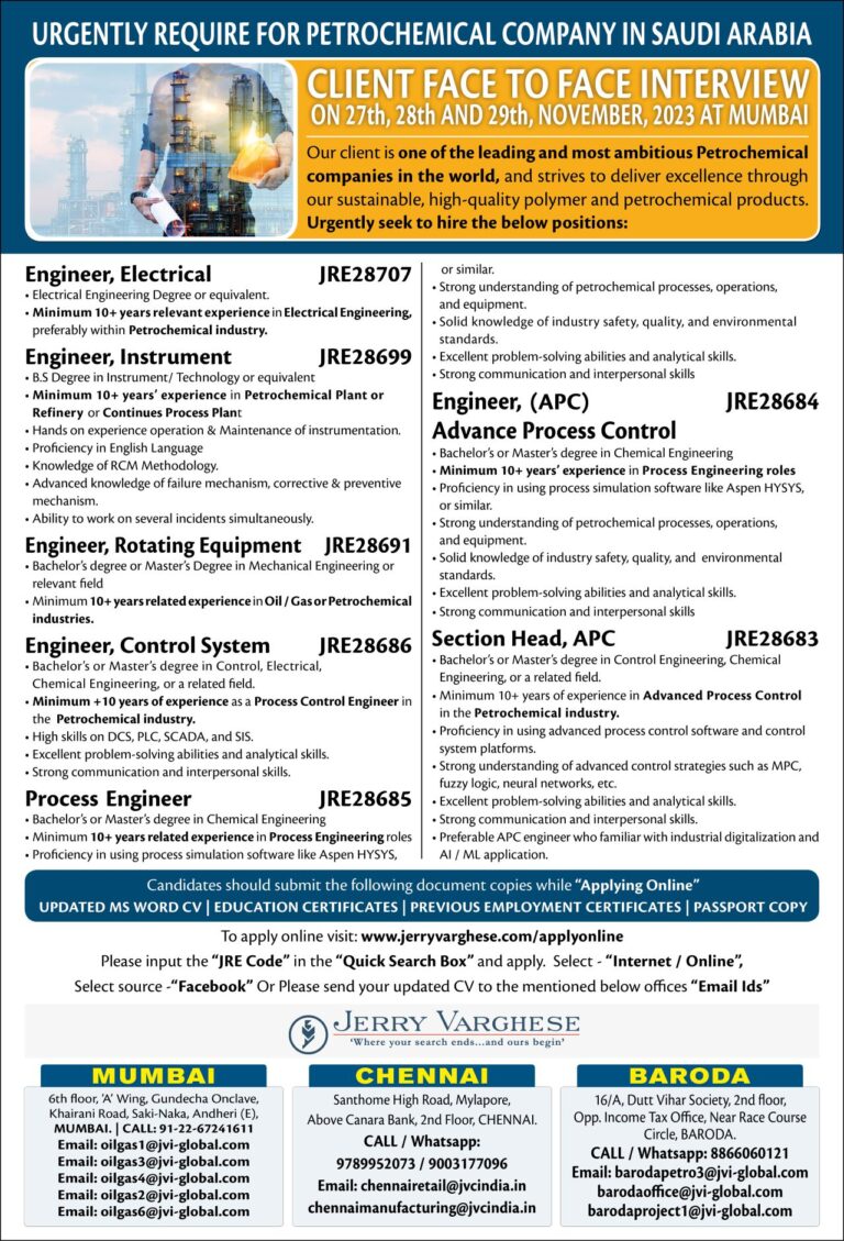 URGENTLY REQUIRE FOR PETROCHEMICAL COMPANY IN SAUDI ARABIACLIENT FACE TO FACE INTERVIEWON 27th, 28th AND 29th, NOVEMBER, 2023 AT MUMBAIOur …
