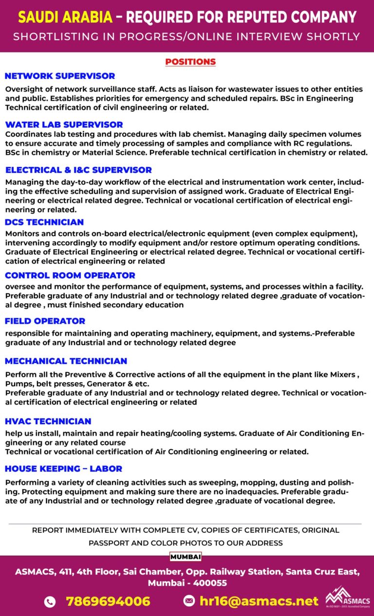 REQUIRED FOR REPUTED COMPANY(BUILDING OPERATION & MAINTENANCE PROJECT)JOB LOCATION – SAUDI ARABIALOOKING FOR BELOW JOB POSITIONSWALKIN FOR SHORTLISTING ON 01ST,02ND …