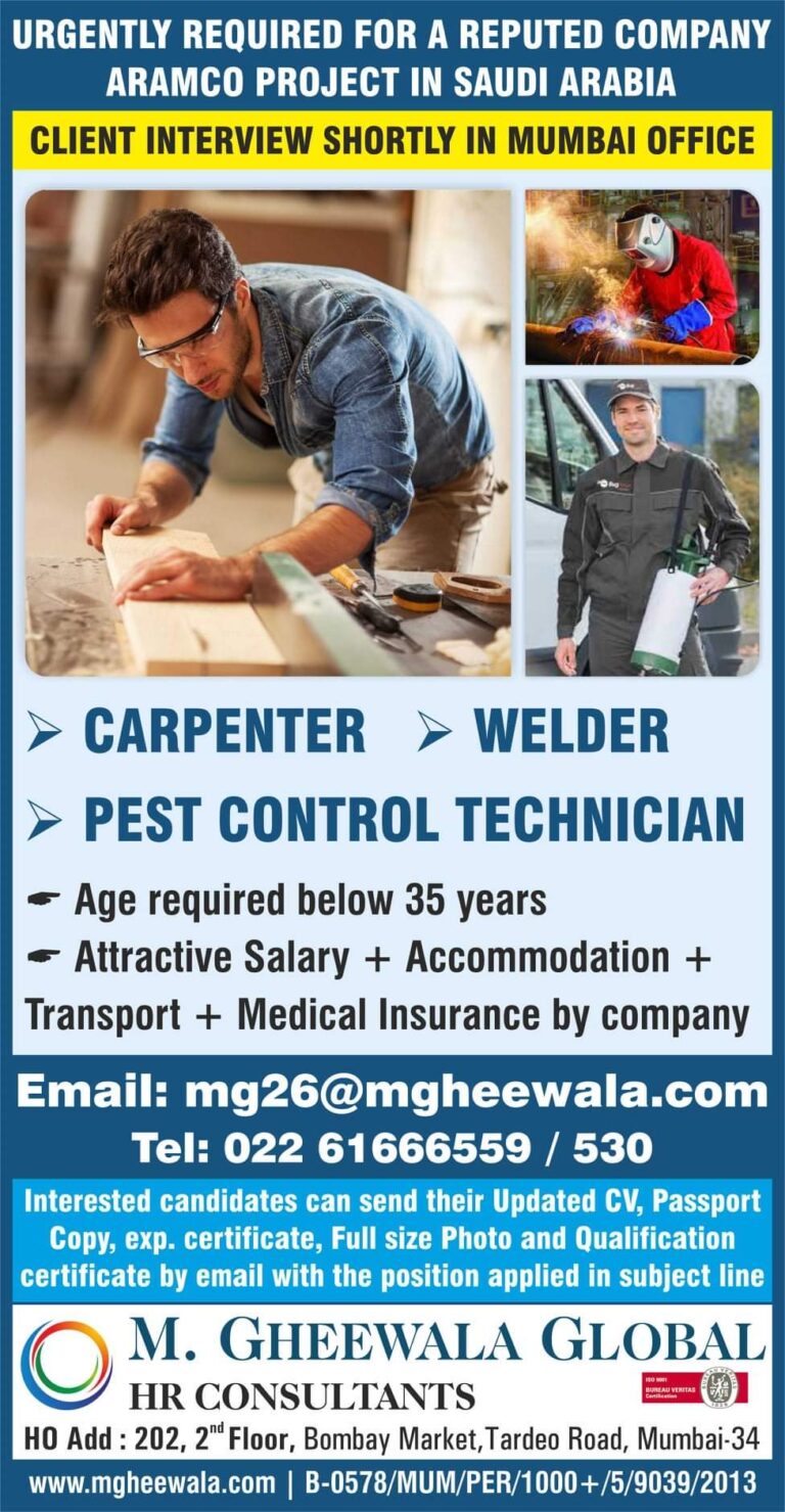 URGENTLY REQUIRED FOR A REPUTED COMPANYARAMCO PROJECT IN SAUDI ARABIA CLIENT INTERVIEW SHORTLY IN MUMBAI OFFICE→ CARPENTER > WELDER ▸ …