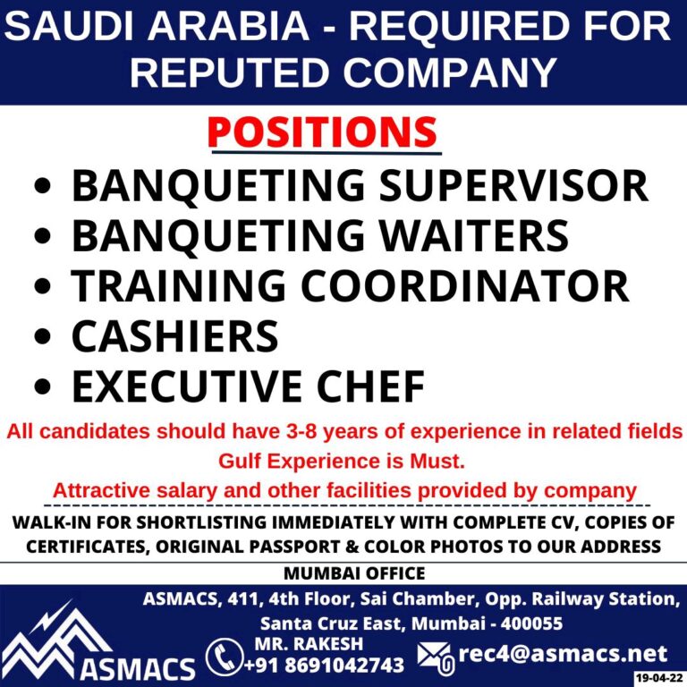 SAUDI ARABIA – REQUIRED FORREPUTED COMPANYPOSITIONS• BANQUETING SUPERVISOR• BANQUETING WAITERS• TRAINING COORDINATOR• CASHIERS• EXECUTIVE CHEFAll candidates should have 3-8 years …