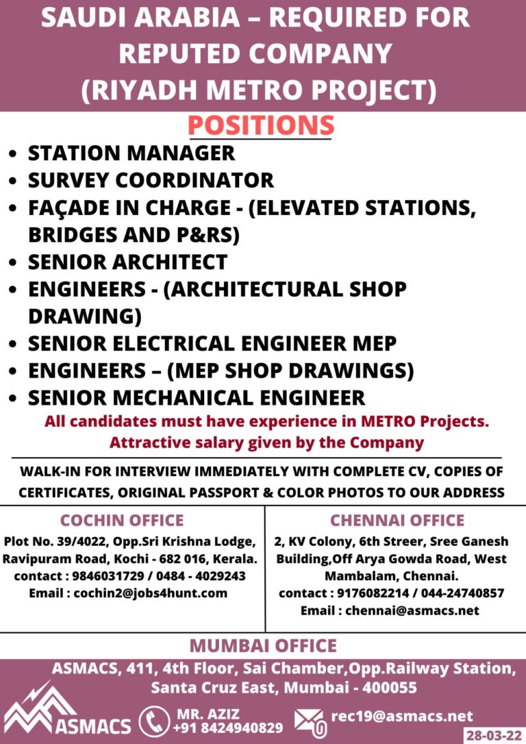 SAUDI ARABIA – REQUIRED FORREPUTED COMPANY(RIYADH METRO PROJECT)POSITIONS• STATION MANAGER• SURVEY COORDINATORFAÇADE IN CHARGE – (ELEVATED STATIONS,BRIDGES AND P&RS)• SENIOR …