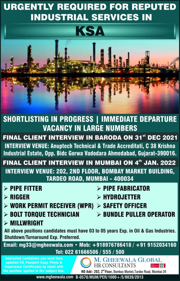 URGENTLY REQUIRED FOR REPUTEDINDUSTRIAL SERVICES INKSASHORTLISTING IN PROGRESS IMMEDIATE DEPARTUREVACANCY IN LARGE NUMBERSFINAL CLIENT INTERVIEW IN BARODA ON 31 DEC …