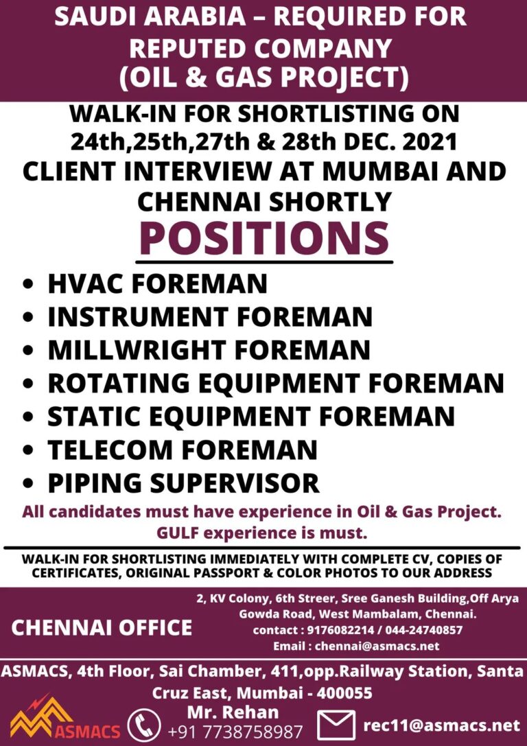 SAUDI ARABIA – REQUIRED FORREPUTED COMPANY(OIL & GAS PROJECT)WALK-IN FOR SHORTLISTING ON24th, 25th, 27th & 28th DEC. 2021CLIENT INTERVIEW AT …
