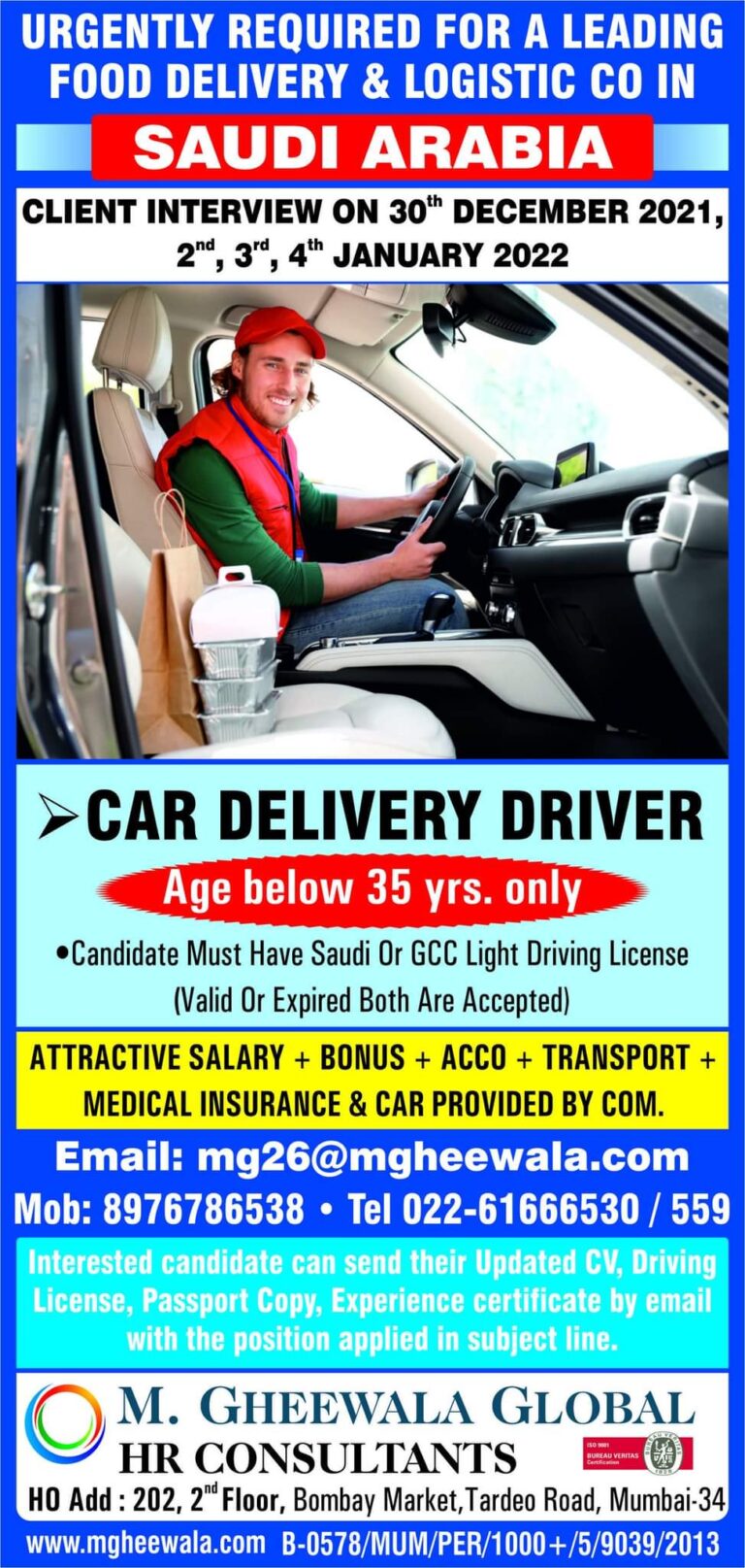 URGENTLY REQUIRED FOR A LEADINGFOOD DELIVERY & LOGISTIC CO INSAUDI ARABIACLIENT INTERVIEW ON 30th DECEMBER 2021,2nd, 3rd, 4th JANUARY 2022CAR …