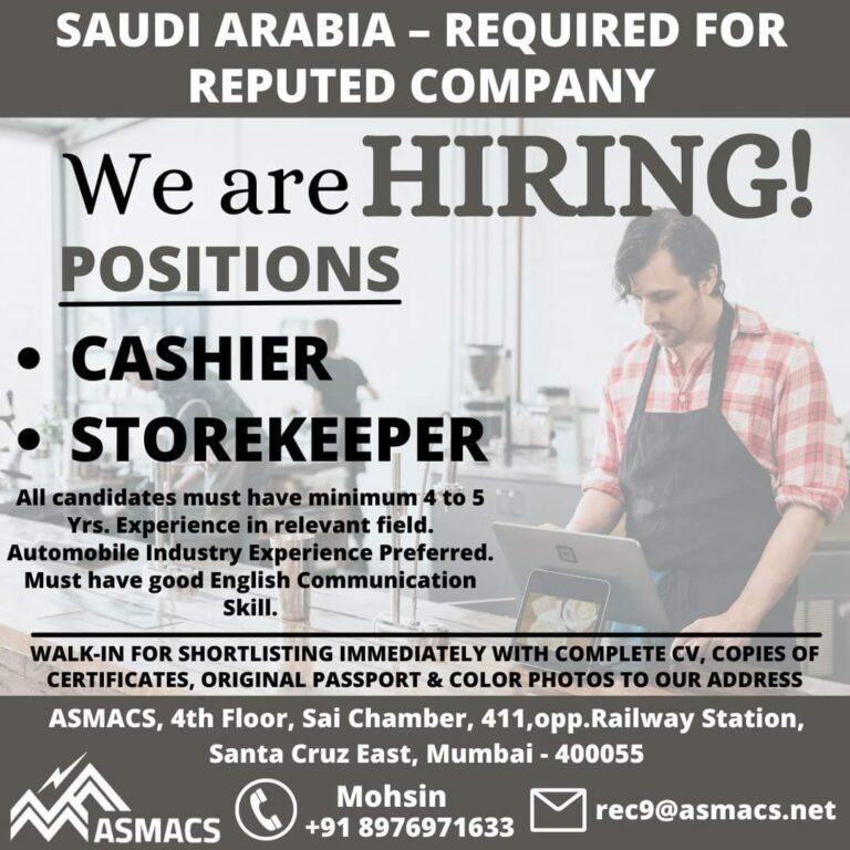 SAUDI ARABIA – REQUIRED FORREPUTED COMPANYWe are HIRING!POSITIONS• CASHIERSTOREKEEPERAll candidates must have minimum 4 to 5Yrs. Experience in relevant field.Automobile …