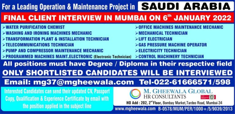 For a Leading Operation & Maintenance Project in SAUDI ARABIAFINAL CLIENT INTERVIEW IN MUMBAI ON 6th JANUARY 2022 WATER PURIFICATION …