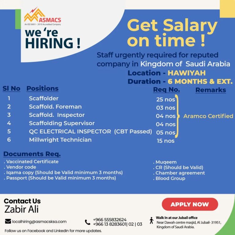 Staff urgently required for reputedcompany in Kingdom of Saudi ArabiaLocation – HAWIYAHDuration – 6 MONTHS & EXT.SI No PositionsReq No. …