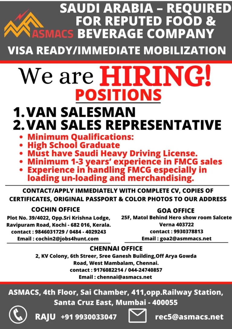 SAUDI ARABIA – REQUIREDFOR REPUTED FOOD &ASMACS BEVERAGE COMPANYVISA READY/IMMEDIATE MOBILIZATIONWe are HIRING!POSITIONS VAN SALESMAN VAN SALES REPRESENTATIVE• Minimum Qualifications:High …